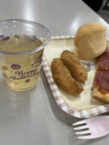 昼食はピザにチキン、ディナーロールを楽しみ、、、