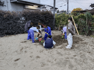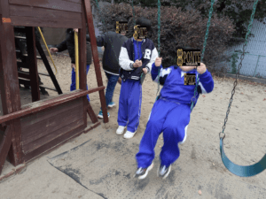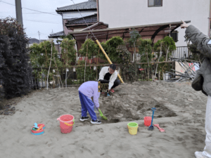 お外遊び🎵 こんにちは、ぽんてラボの刈部です🎶 今日はみんな大好きお外遊びの日! 寒空、途中ポツポツと雨が降ってきましたが、元気いっぱいな子どもたちです😆 鬼ごっこやブランコ、思い思いの時間を過ごしています✨ 最初は現場監督Nさんの下工事をするスタッフのみでしたが、終盤はみんな大集合し、土木工事をしていました😉 最近は体調不良の子が多く、学校も学級閉鎖だったり学年閉鎖だったり、、、 お家に帰ったらうがい・手洗い忘れずに行っていきましょう☺
